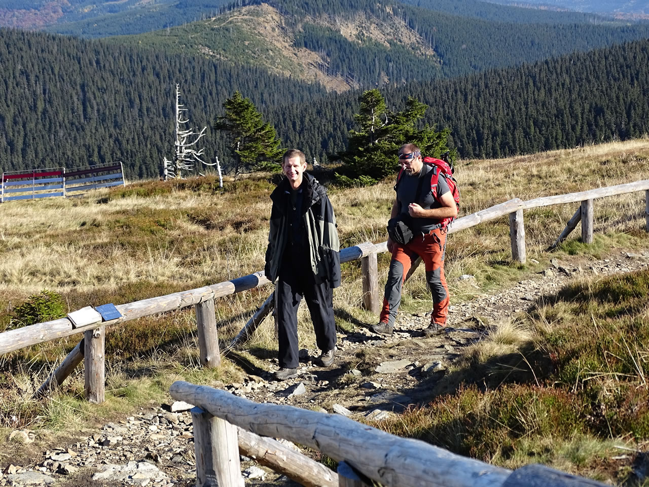 Trasa vedla z Karlova k Velkému kotli, který byl nádherně nasvícen. Pravda, kamzíky jsme letos neviděli, ale zato Jana se Zdenkem z hřebenovky viděli Sněžku! Dále jsme pokračovali kolem Petrových kamenů po hřebenovce na Vysokou holi a došli k Jelení studánce. Tady si uvařili kafíno, udělali hodinový veget a pak sešli přes Alfrédku zpět do Karlova. Byl to kouzelný a pohodový den.